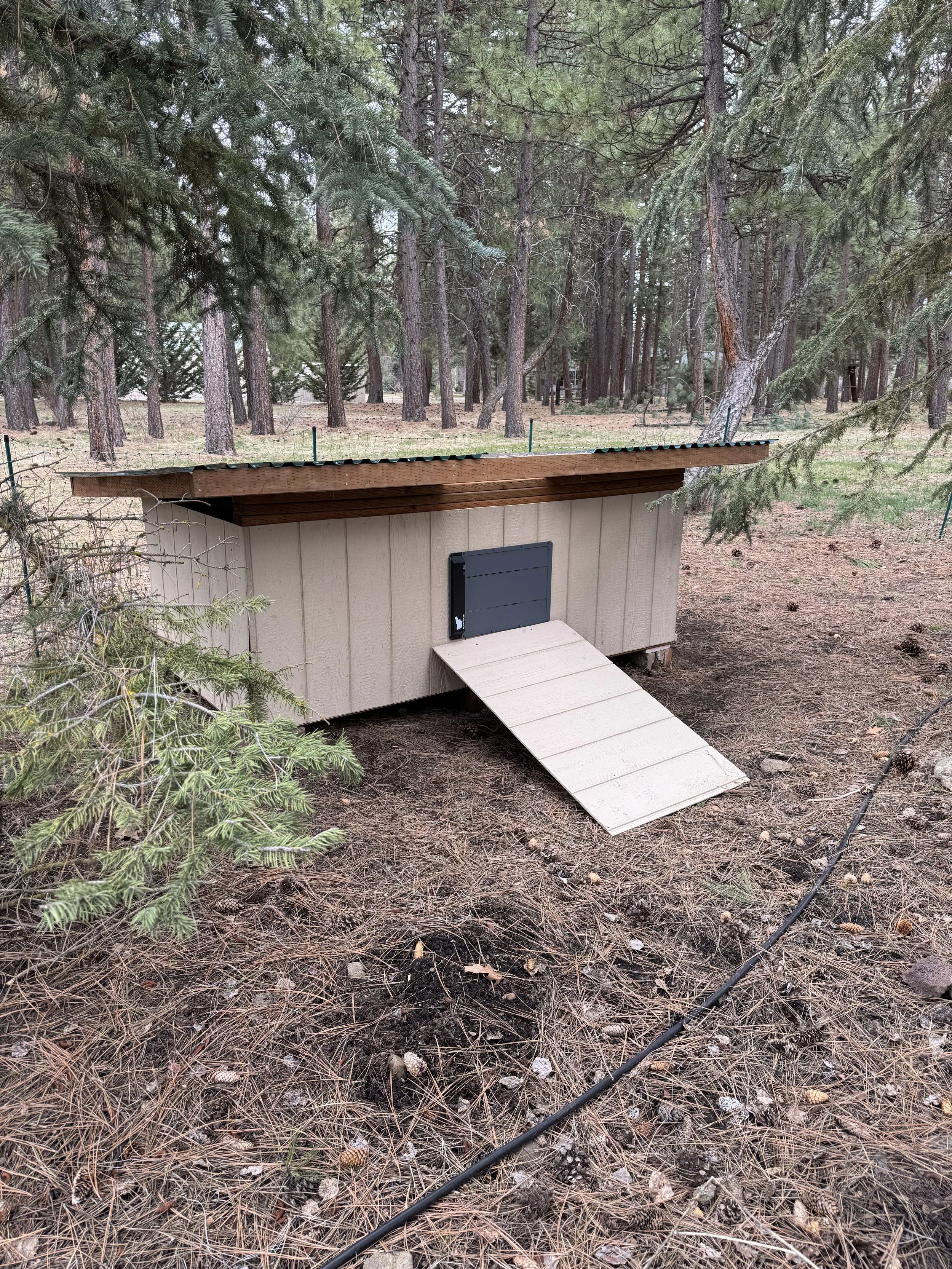 We cut siding panels to 33 inches tall so they would slightly overhang the base and help protect the wood frame from splashes and puddles. The siding went up quickly, and we left one of the back panels loose and added hinges to turn it into a swing-out cleaning door. This is our favorite feature—it functions as a built-in poop chute and makes cleaning out the bedding quick and painless. We can just open the panel and scoop everything right into the compost.