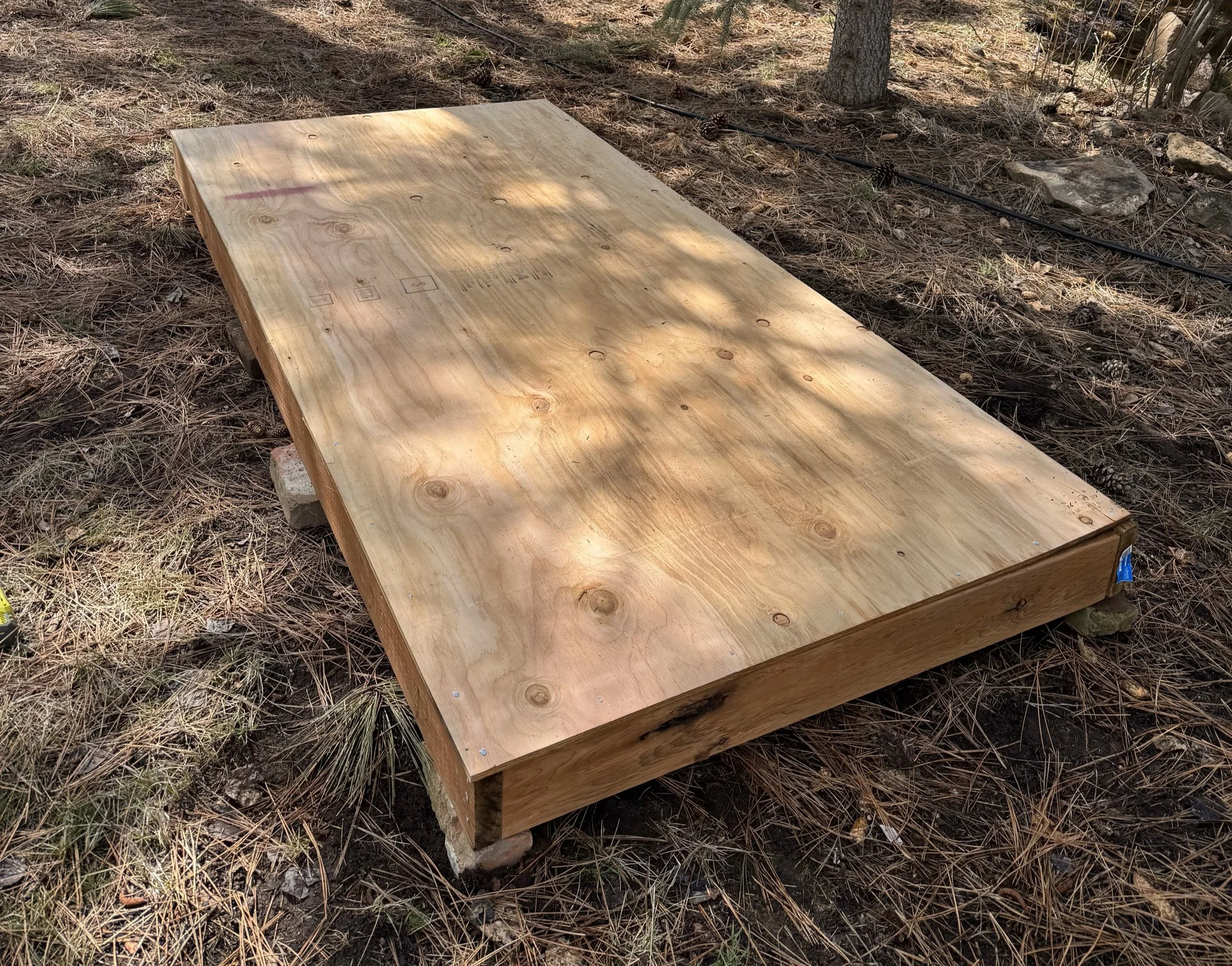 We used a 4-foot by 8-foot sheet of 1/2-inch plywood as the floor and built everything around that footprint. For the base frame, we used 2x6 pressure-treated ground contact lumber to outline the floor and added 2x6s in the center underneath for support. Instead of placing the structure directly on the ground, we stacked salvaged bricks in key spots to act as piers and level everything out. These bricks help protect the wood from ground moisture.