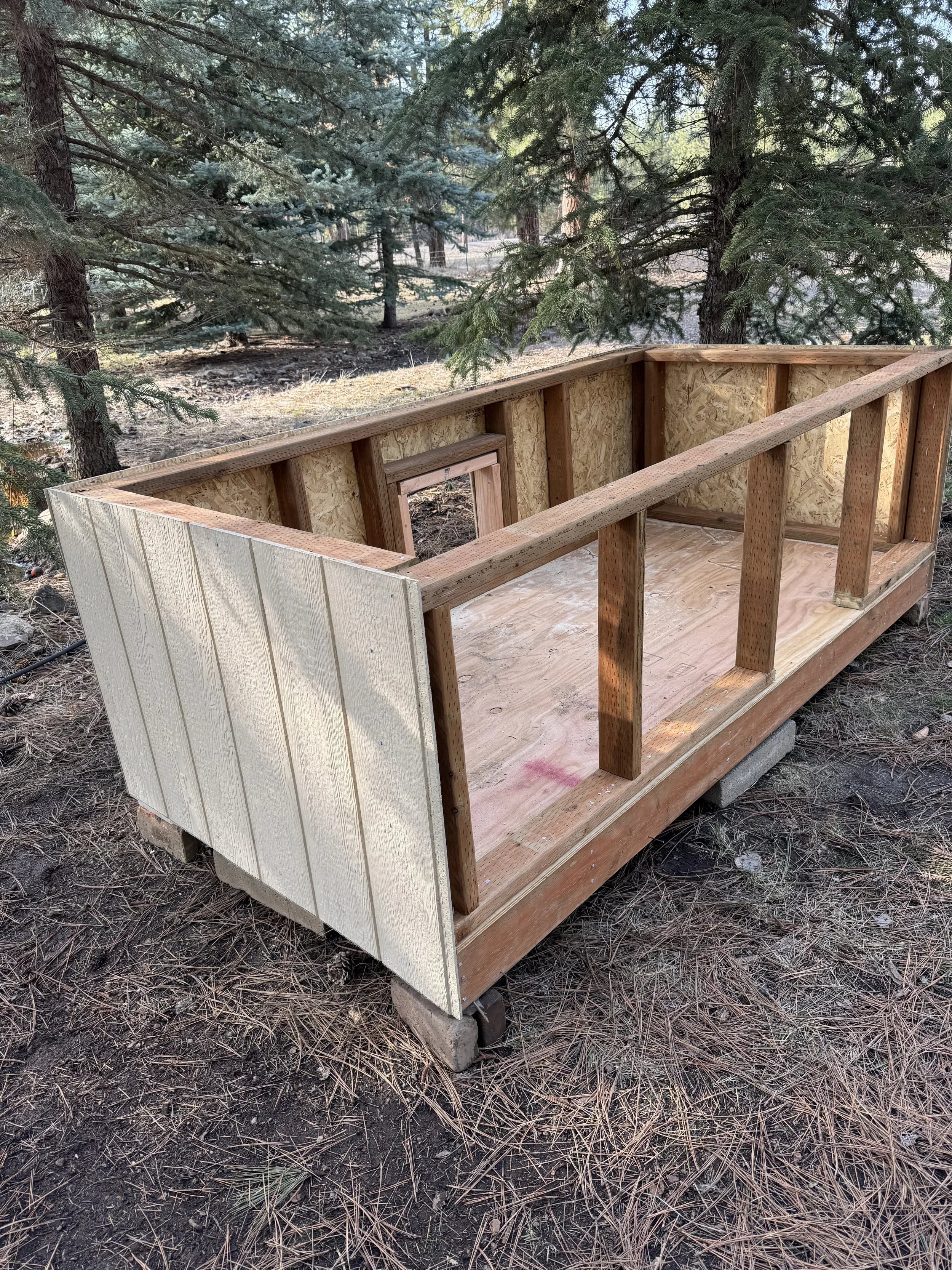 We designed the roof as a lean-to style with a gentle slope to allow rain and snow to run off. To create the slope, we nailed three 2x4s horizontally along the top of the front wall, making it slightly higher than the back. This gave us the right angle for water drainage while keeping the structure simple.