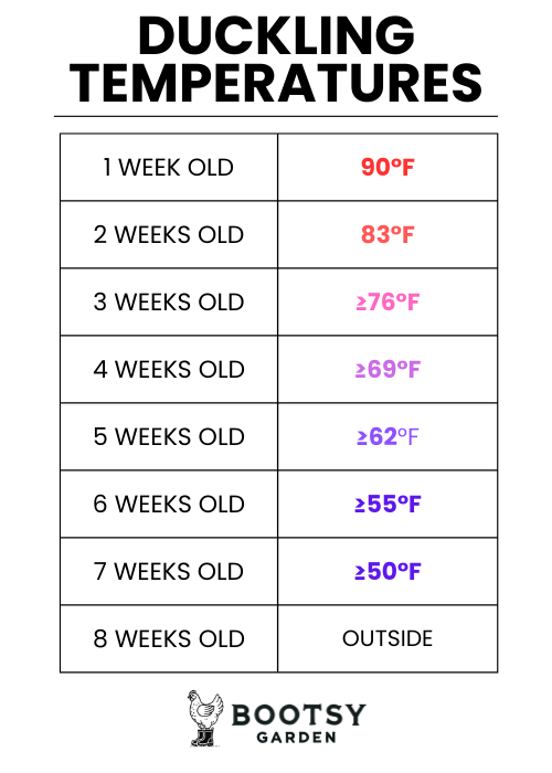 Another issue to watch for is overheating. If you notice your ducklings panting, holding their wings away from their bodies, or stretching their legs out behind them, it’s a sign that they’re too hot. Unlike chicks, ducklings are more sensitive to heat and can quickly become stressed if their brooder is too warm. Make sure there’s enough space in the brooder for them to move away from the heat source if needed, and monitor the temperature closely. A thermometer at duckling level is super helpful here — aim for around 90°F during the first week, then drop it by about 7°F each week as they grow and feather out.
